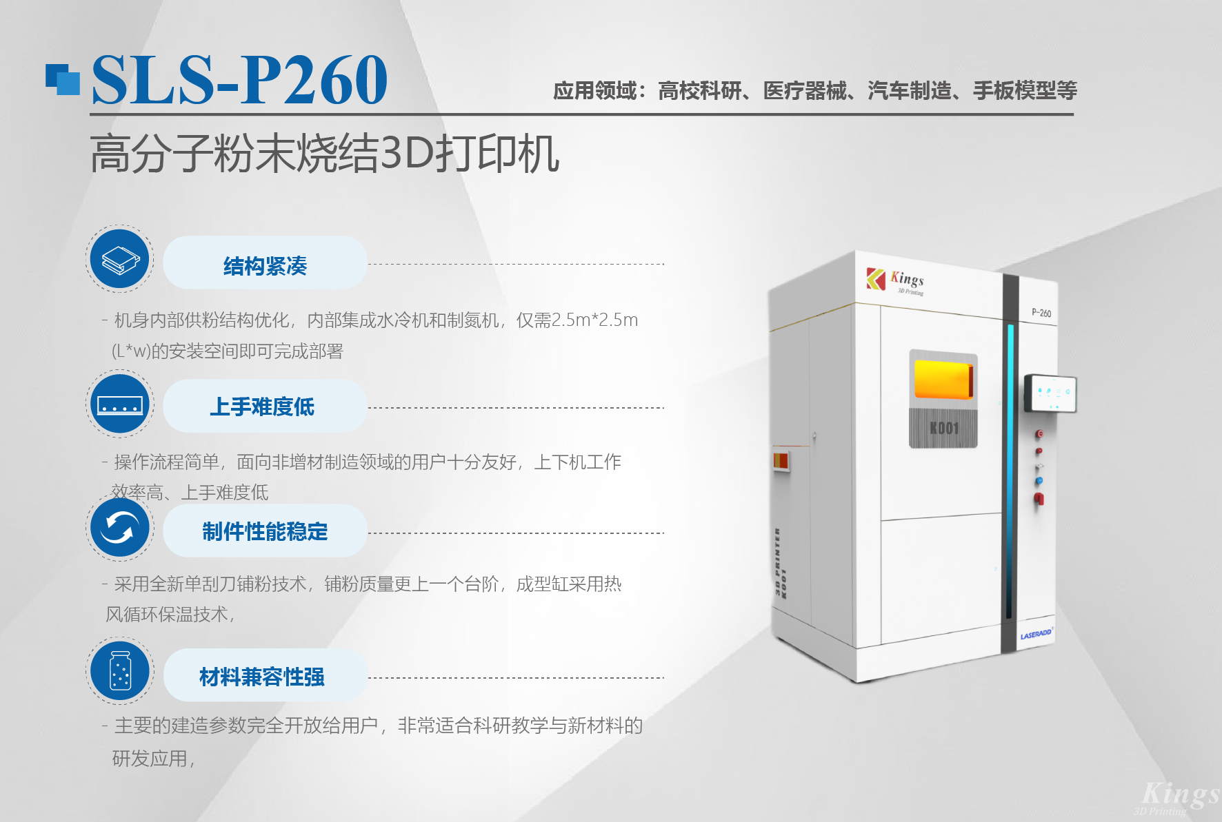 金石三維最新推出的高分子粉末燒結(jié)3D打印機(jī)——SLS-P260將在本次展會(huì)首次亮相,該設(shè)備采用全新設(shè)計(jì)的供鋪粉系統(tǒng)、成型缸二段提升及打印平臺(tái)升降技術(shù),具有結(jié)構(gòu)緊湊、操作簡(jiǎn)單、部署便捷、制件性能穩(wěn)定、參數(shù)開(kāi)源開(kāi)放、性價(jià)比高等特點(diǎn),廣泛適用于高校、科研院所、醫(yī)療器械、汽車(chē)制造等領(lǐng)域的設(shè)計(jì)驗(yàn)證、生產(chǎn)制造等需求。