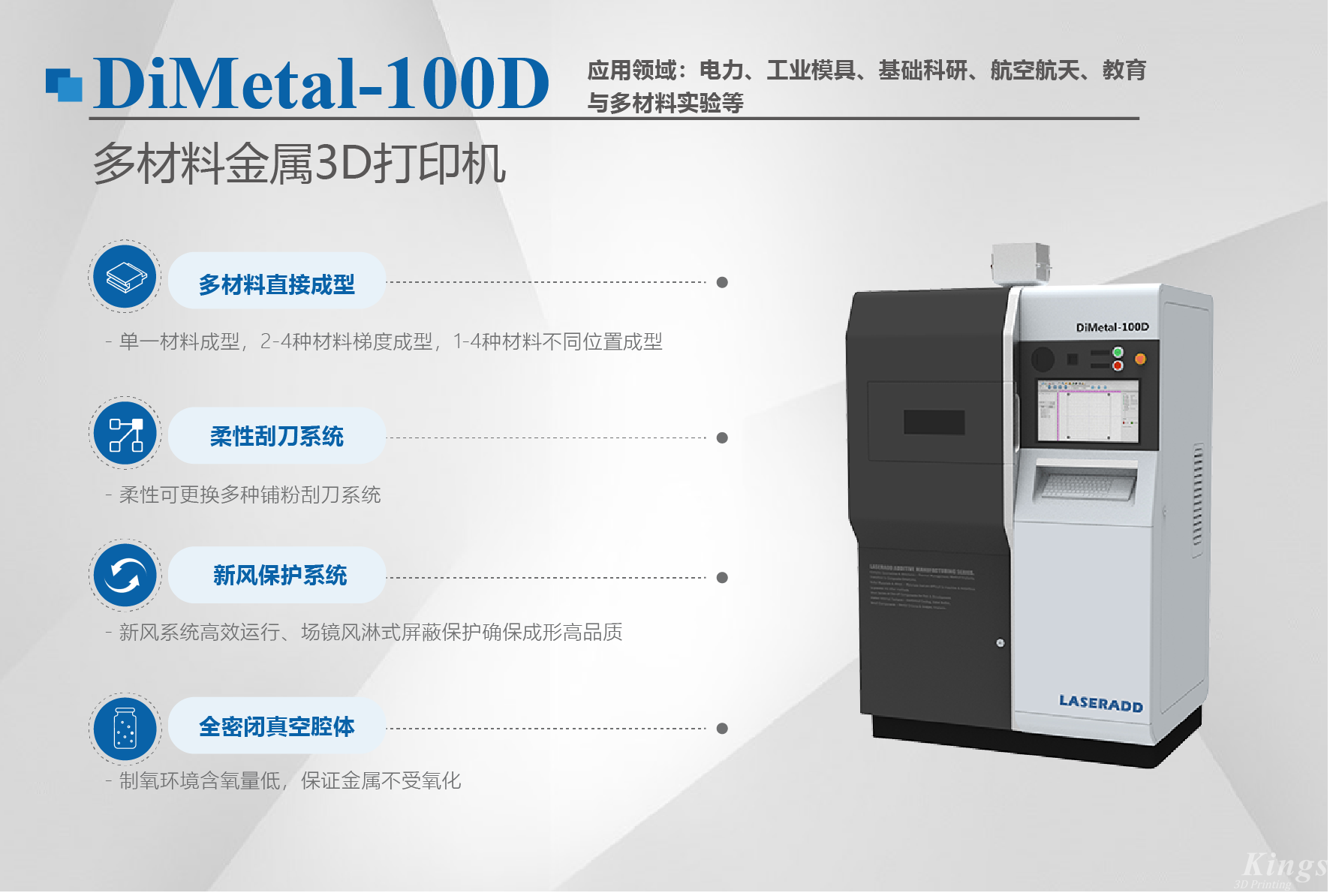 本次展會(huì),金石三維將展出獨(dú)具特色的多材料金屬打印設(shè)備SLM-100D,該設(shè)備可一次性成形1-4種材料,實(shí)現(xiàn)多材料零件的一次性加工成形,滿足復(fù)雜位置零件對(duì)材料性能的多元化需求,一步提高零件在復(fù)雜使用場(chǎng)景及工況下的材料的設(shè)計(jì)空間,可應(yīng)用于電力、工業(yè)模具、基礎(chǔ)科研、航空航天、教育與多材料實(shí)驗(yàn)等領(lǐng)域。